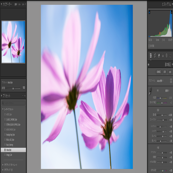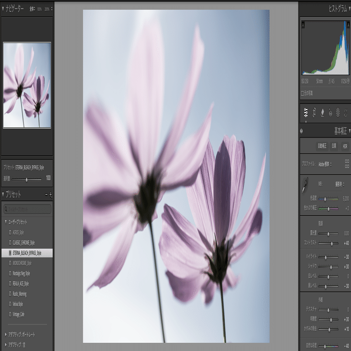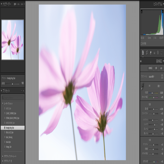 「Rustic _Morning]と「Vintage_Cafe」は花の撮影向けではなくて、物取り(小物撮影)用のプリセットになります。