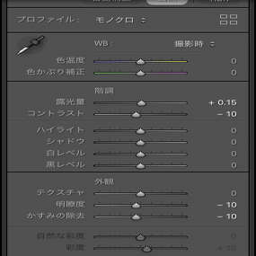 カラーでは少し調整項目が増えますが、「彩度」や「トーンカーブ」の値を参考にしてもらうと良いでしょう。