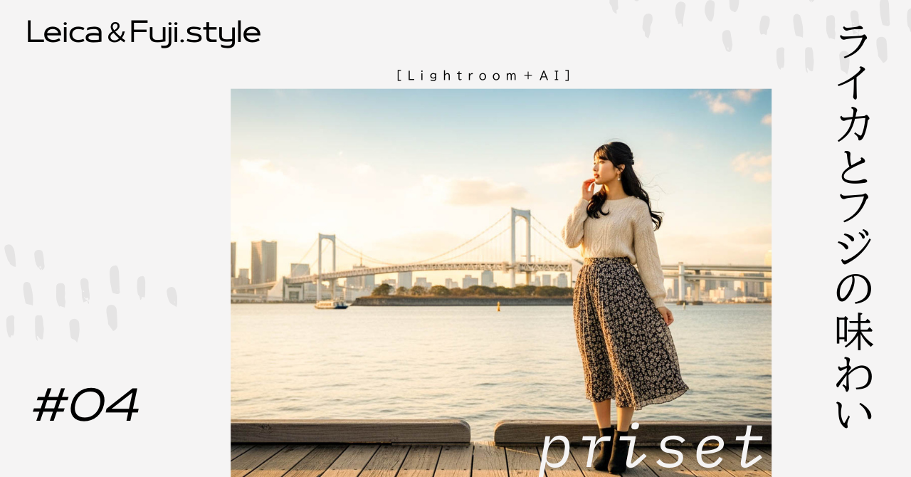 手持ちのカメラや AI 画像でも、ワンクリックで「Leica で撮ったような空気感」と「FUJI フイルムらしい色」を両立させた仕上がりを目指しました。