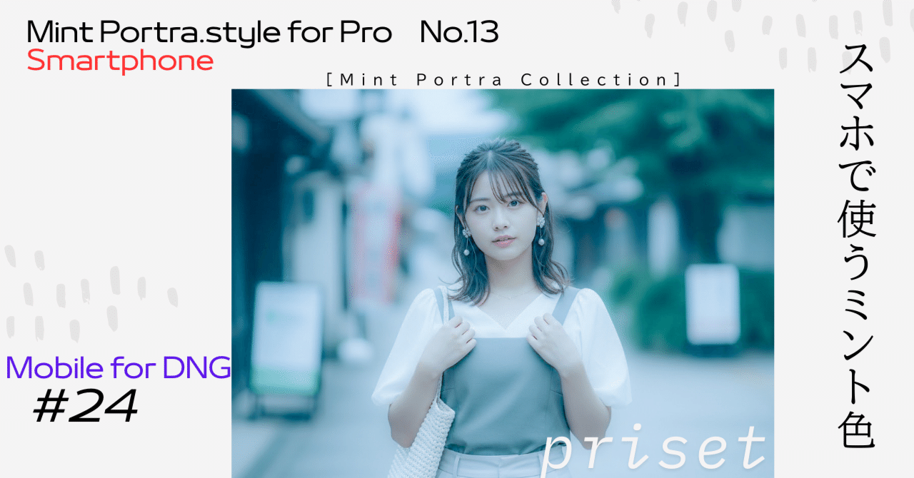 スマホで使えるプリセットです。 #20で紹介しているミント色のプリセットになります。 使用方法は#23と同じやり方です。 このDNGファイルはLightroom(PC版)で開いてプリセットを新規保管すれば使えます。(#20)と同じプリセット...