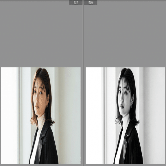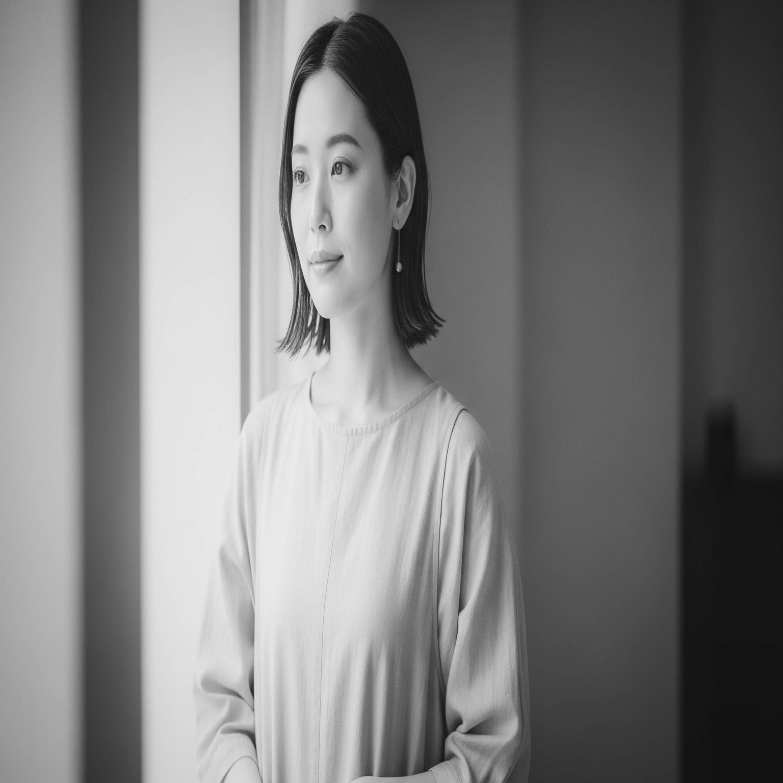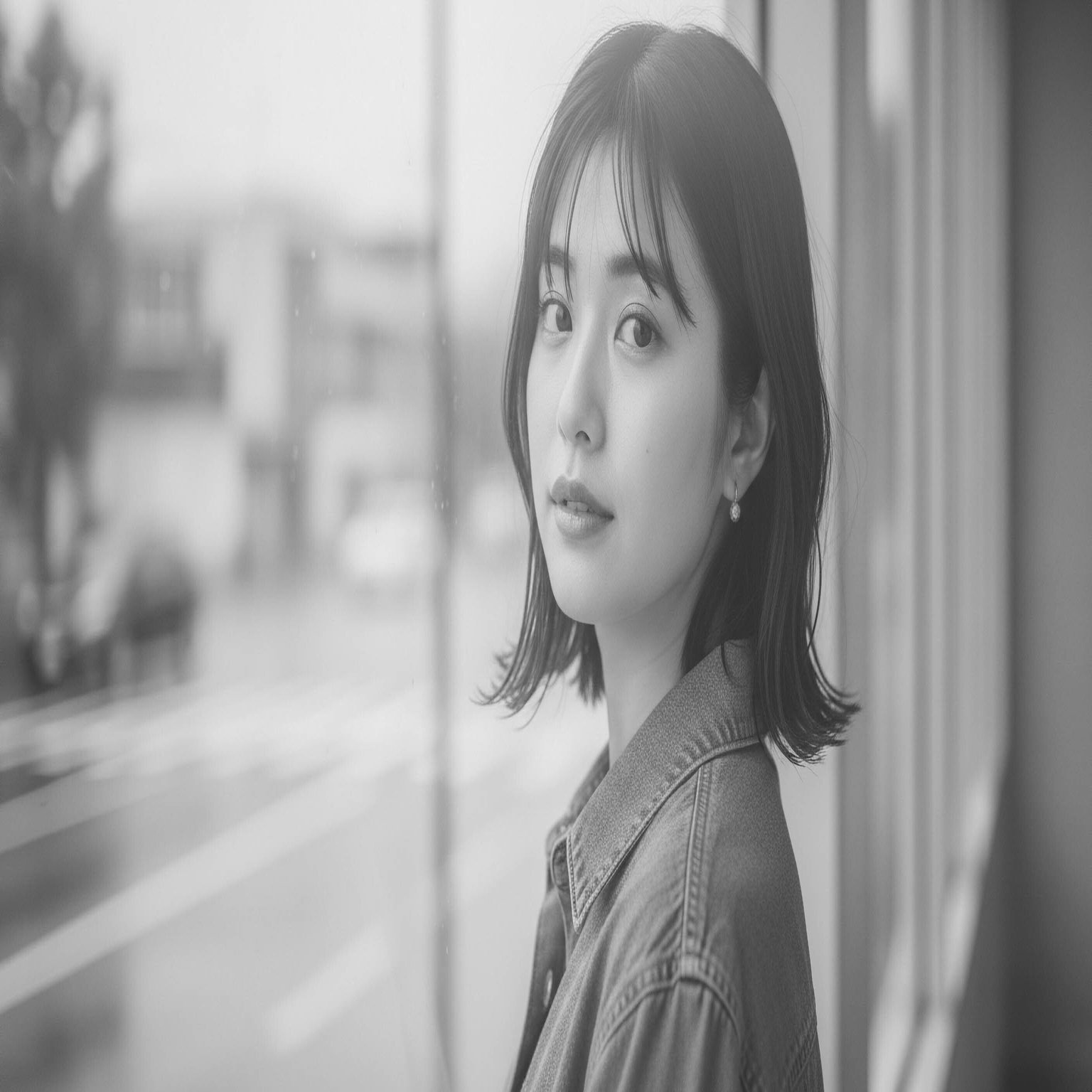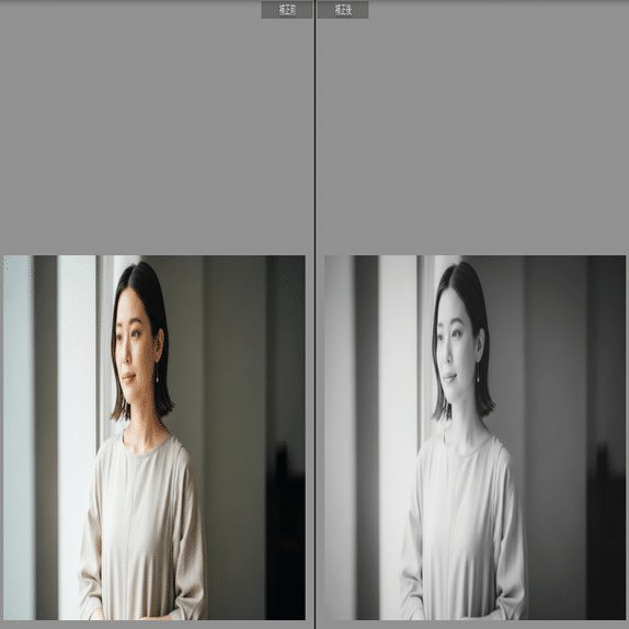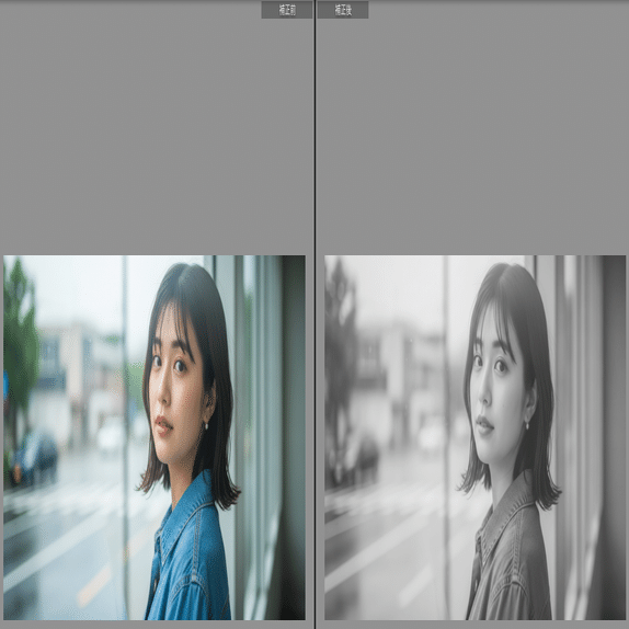 黒をグレーに持ち上げた(フェード)優しいモノクロ。雨の日や室内のポートレートなど、静かな時間を閉じ込めるのに最適です。